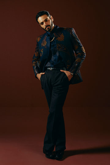 Midnight blue, handmade jacquard Bandhgala jacket exhibits the intricate artistry of Kashmiri craftsmanship. Adorned with paisley floral hand embroidered patterns, delicate French knots, and resham and tilla embellishments. ALL INTERNATIONAL ORDERS WILL BE SHIPPED & DELIVERED WITHIN 10-15 DAYS Promo code...