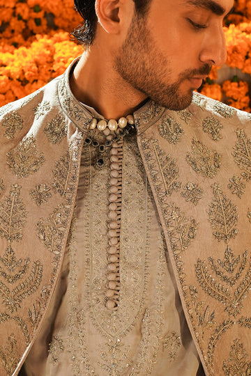 Taupe toned, handmade jacquard sherwani, with hand embroidered geometric and floral patterns merged with tilla embellishments.