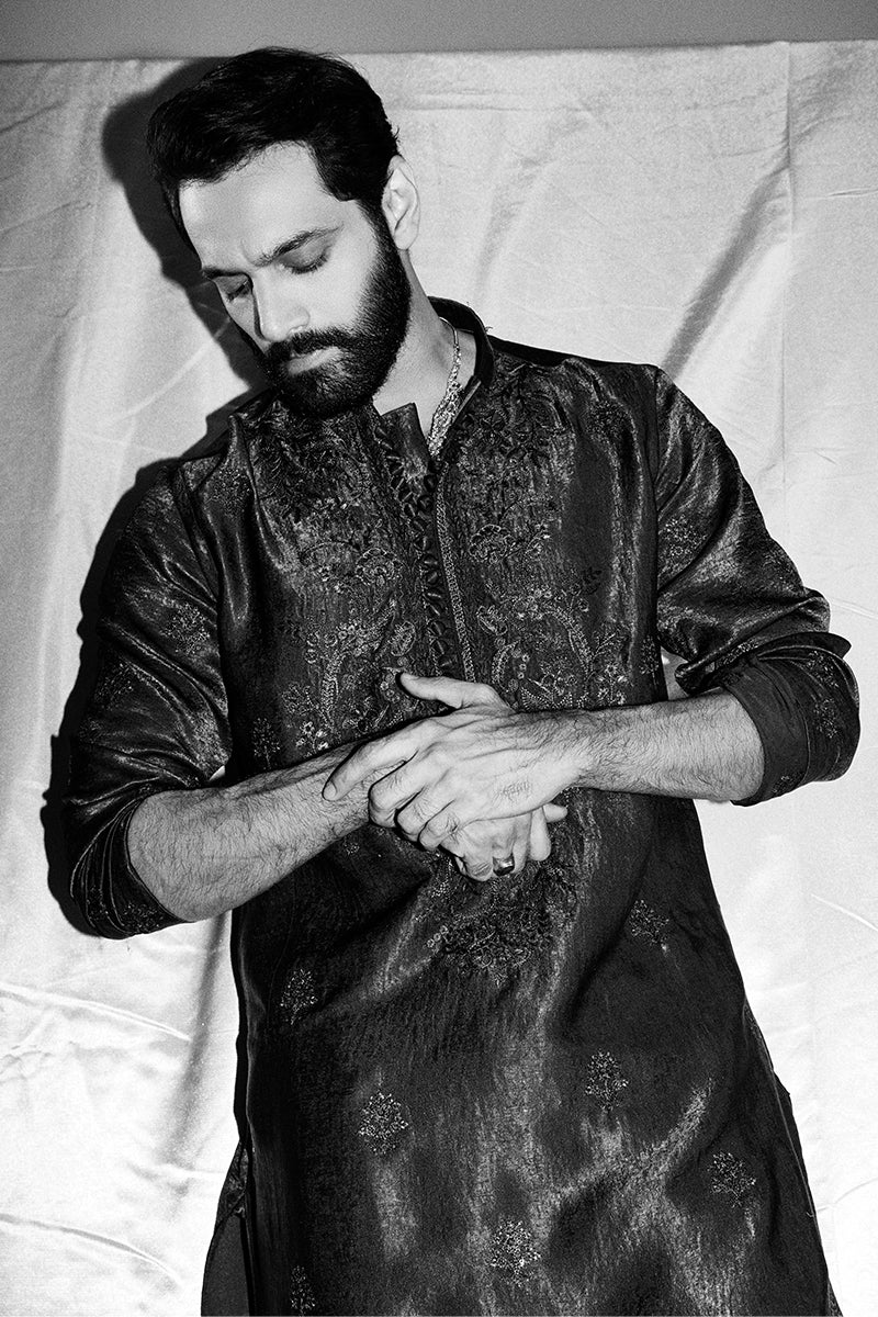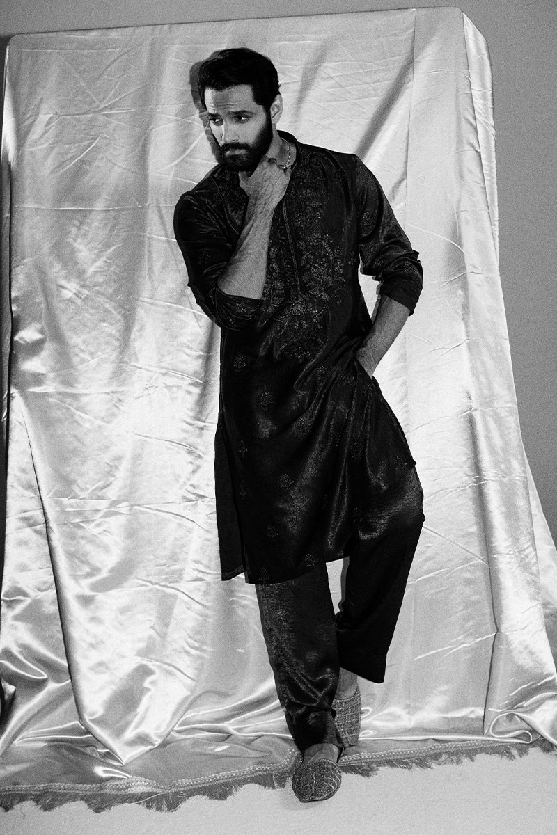 A deep burgundy kurta and pajama set adorned with striking floral embroidered composed neckline and all-over booti chatta accented with shimmering sequins, exuding opulence and refined elegance.