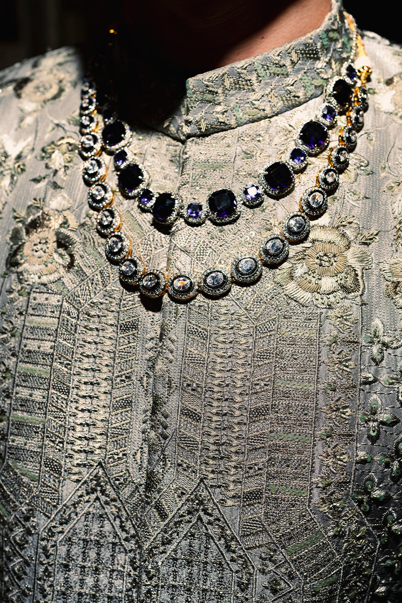 Mud lilac, self jamawar bandh gala jacket, with architectural patterns adorned with sequins and tilla, detailed with geometric jaal and hidden button closure.