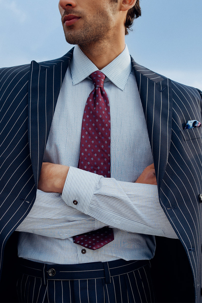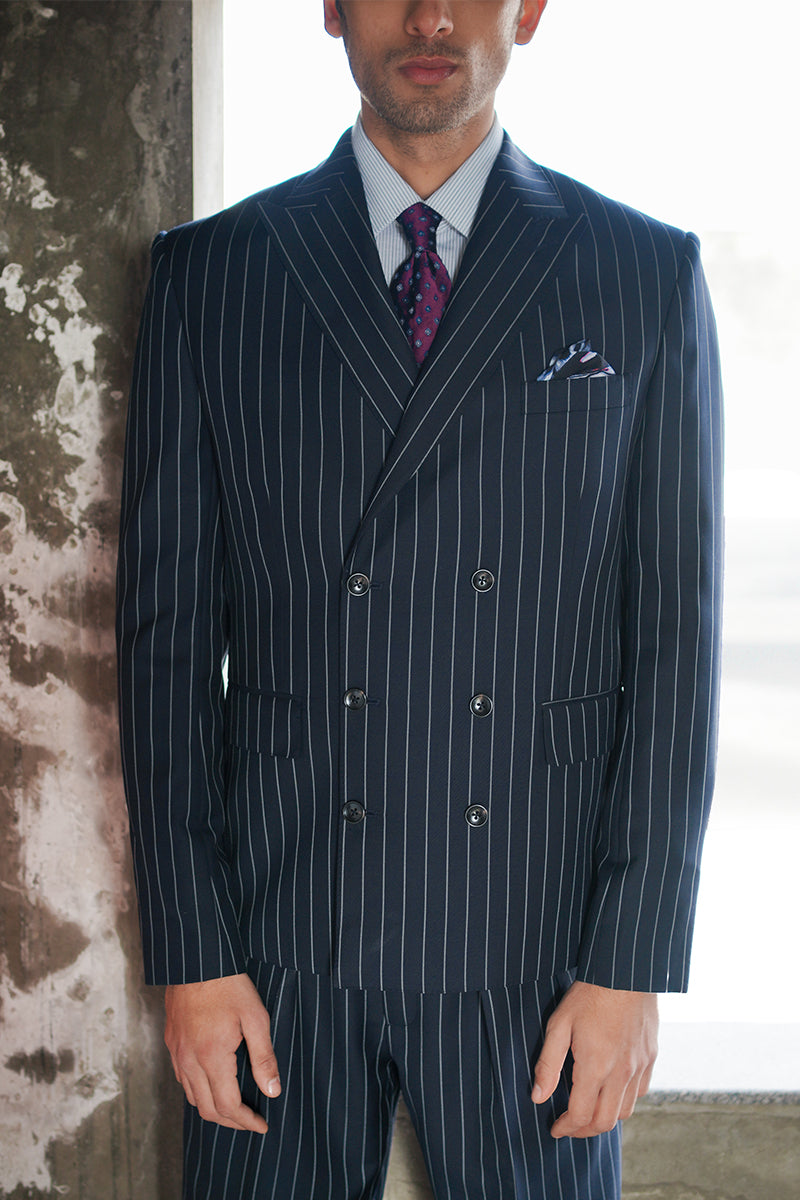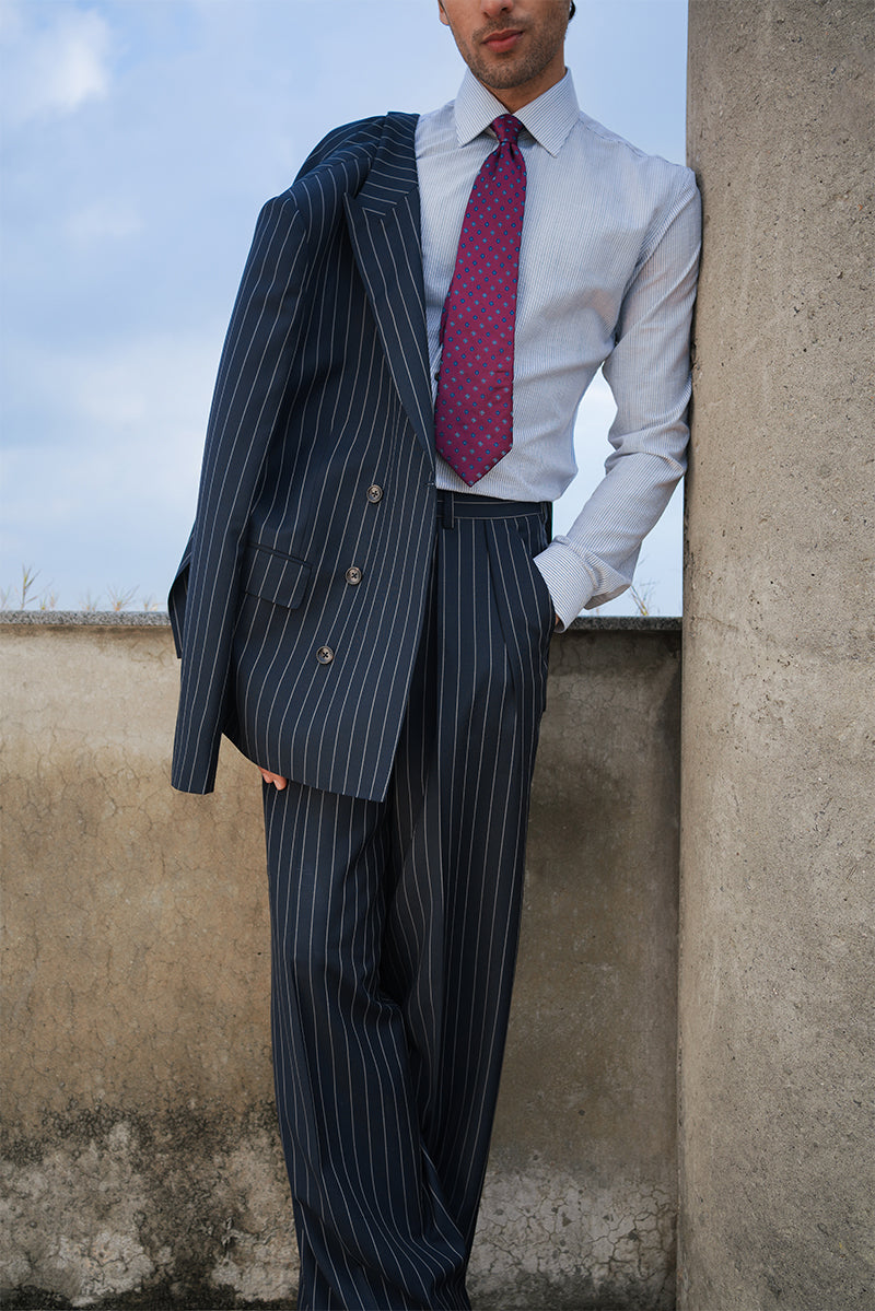 Blue two piece single breasted suit in textured super 130 Italian fabric, detailed with notch collar, single breasted in two buttons closure, paired with straight tailored pants.