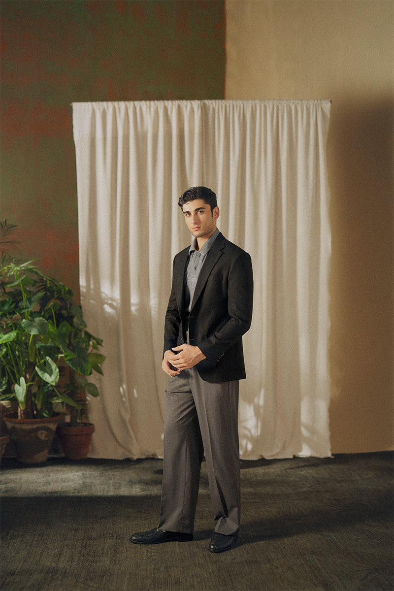 A single breasted two button linen blend blazer tailored for a classic fit detailed with a notch lapel and patch pockets. Detailed with herringbone texture.