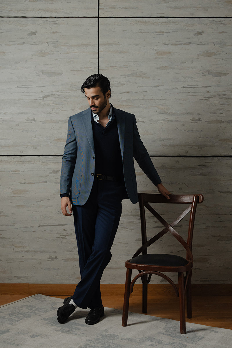 Deep blue, tropical herringbone fabric peak lapel jacket, with two button closure, elbow patch and double slit.