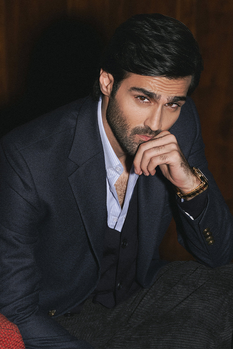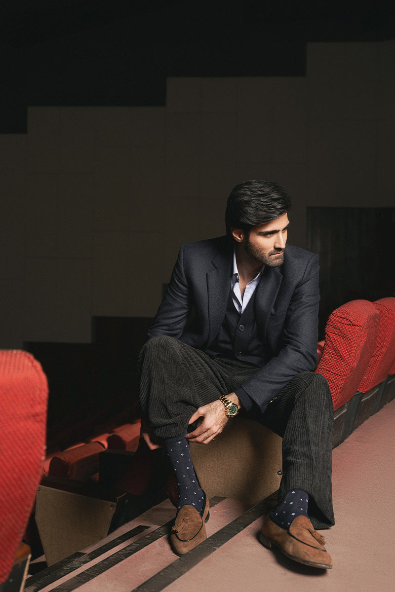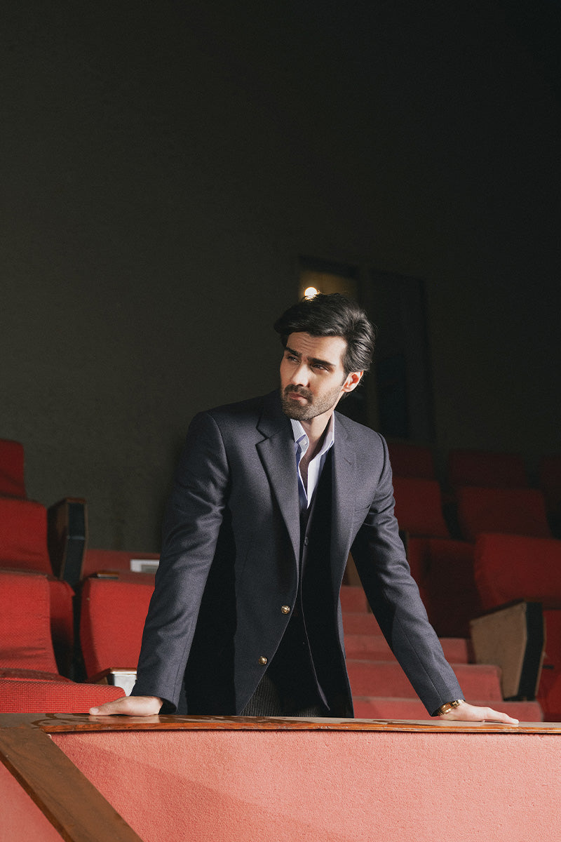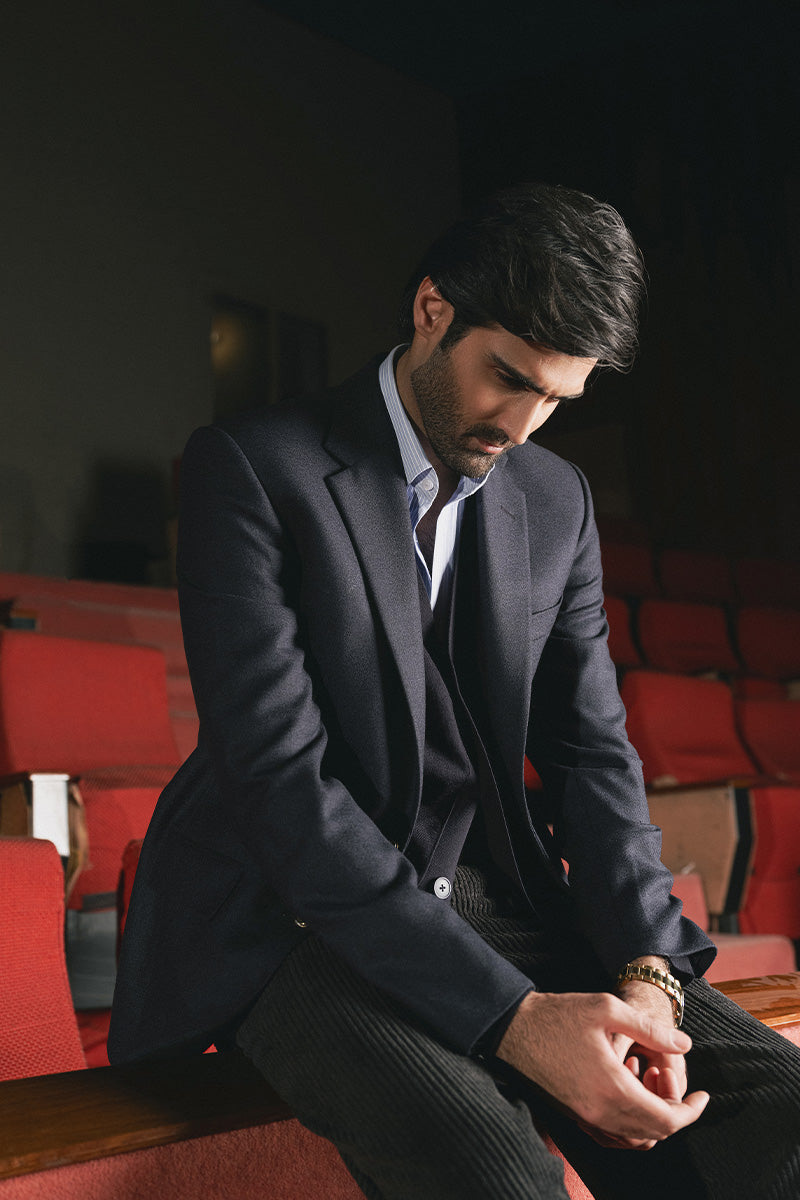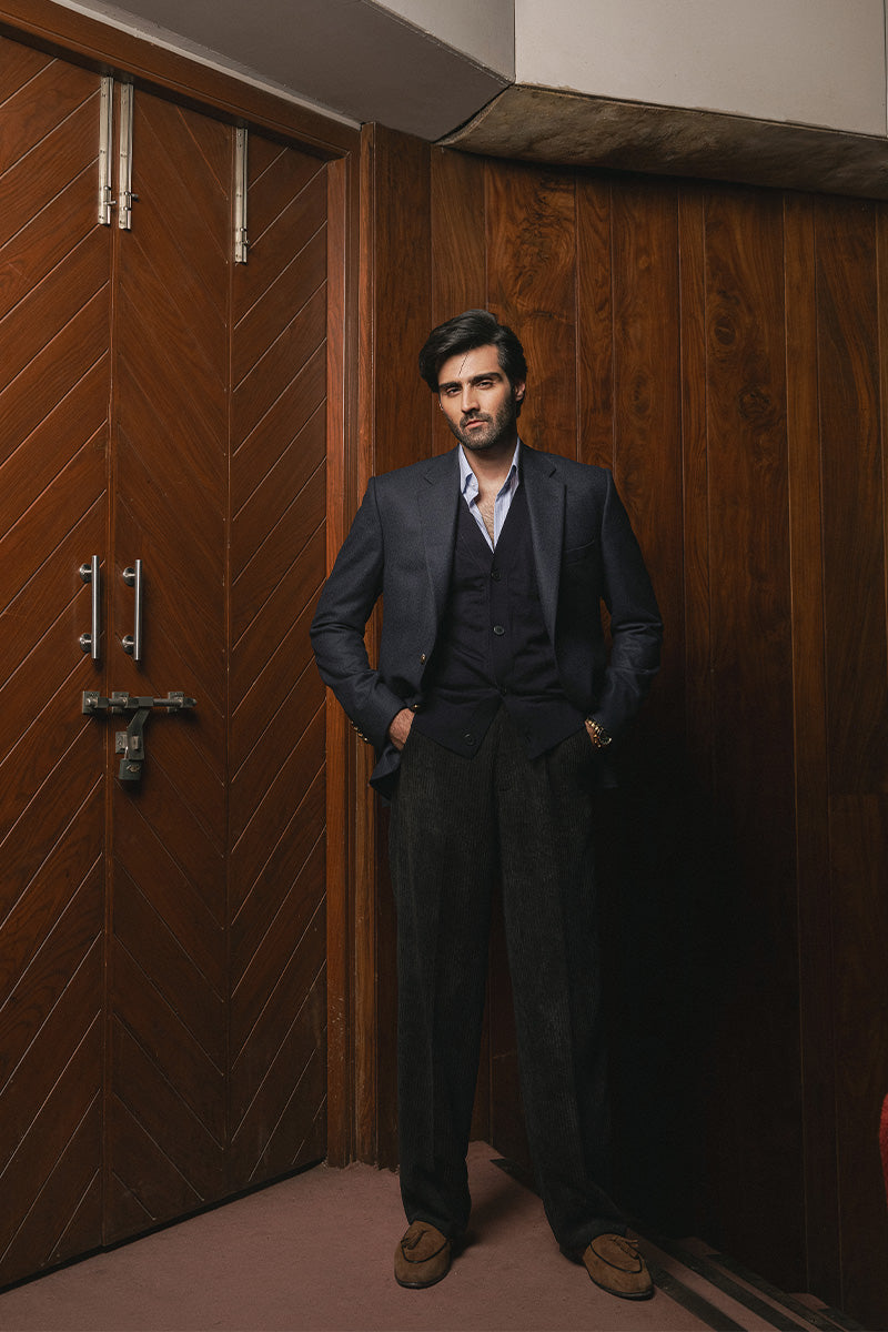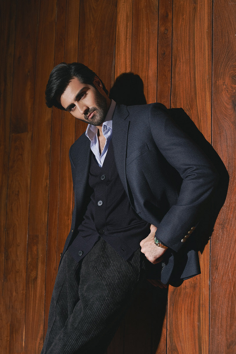 A navy blue blazer in a textured wool blended tropical fabric detailed with a notch lapel and besom pockets.