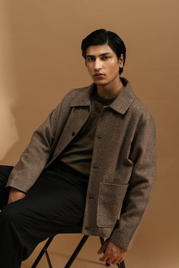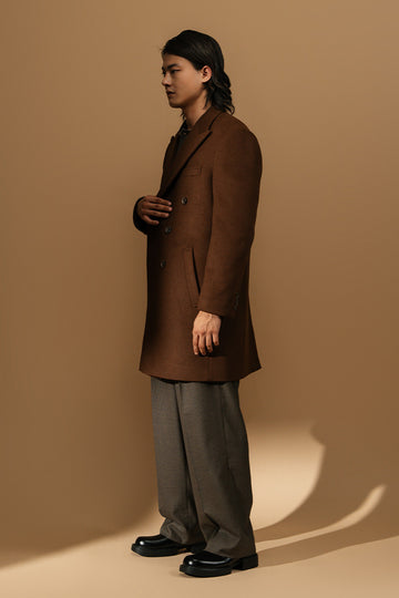 A classic chocolate brown woolen coat detailed with a notch lapel, welt pockets and double buttons, along with a back vent at the center.
