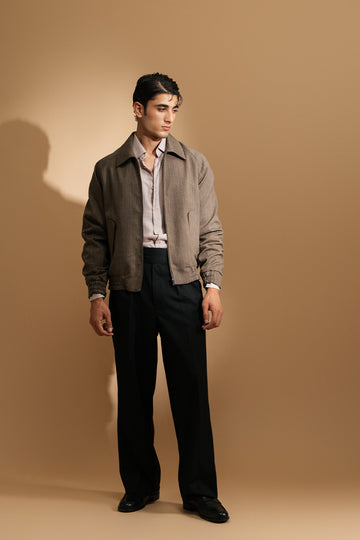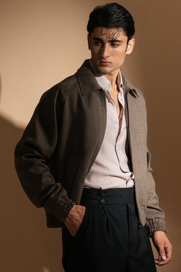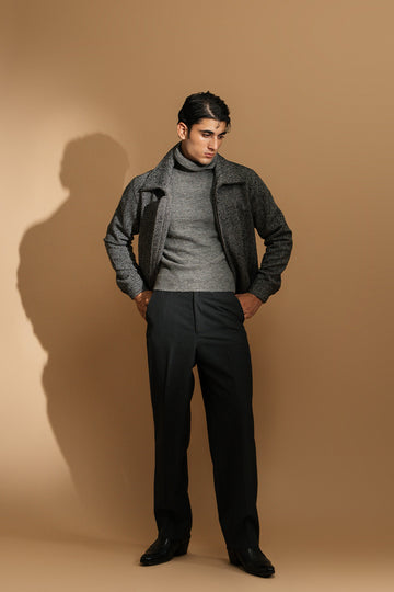 A light grey zip-up jacket in a woolen fabric detailed with a mock neck and welt pockets on the sides with cuffed sleeves and snap buttons.