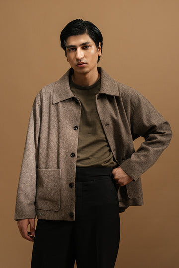 A loose fit overshirt crafted from a structured woolen fabric featuring a collar with side patch pockets and button closures.