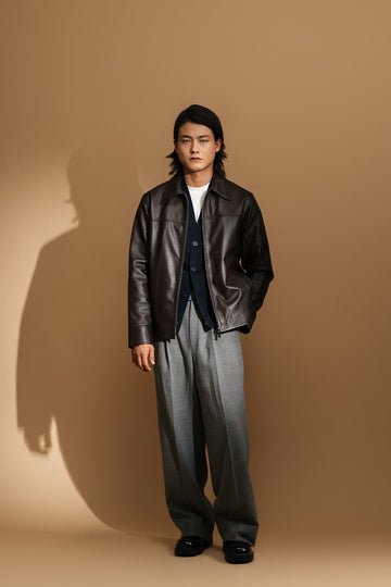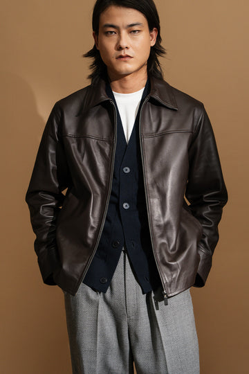 A dark brown premium leather jacket in a regular fit featuring a collar and side seam pockets with raw trims and a zip-up front.
