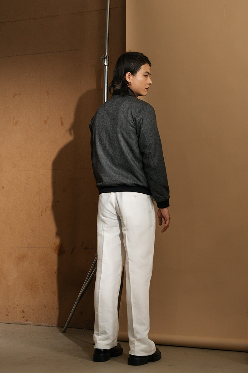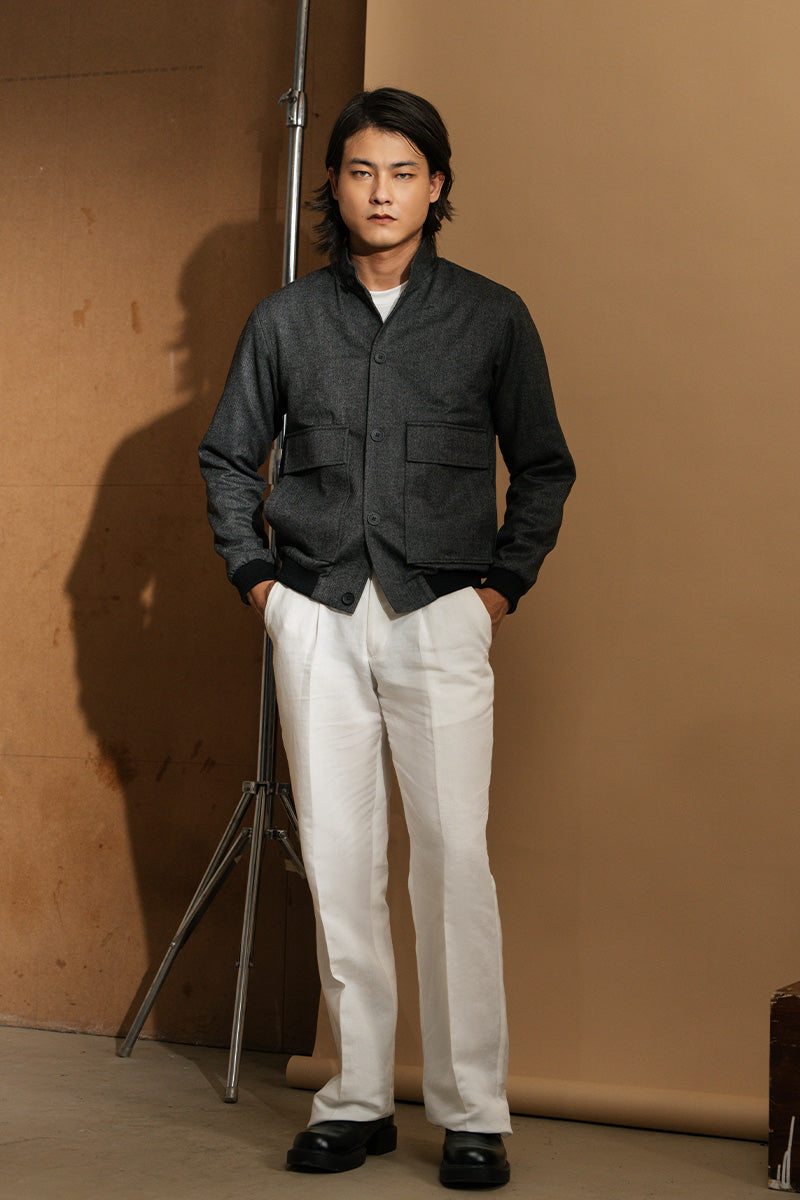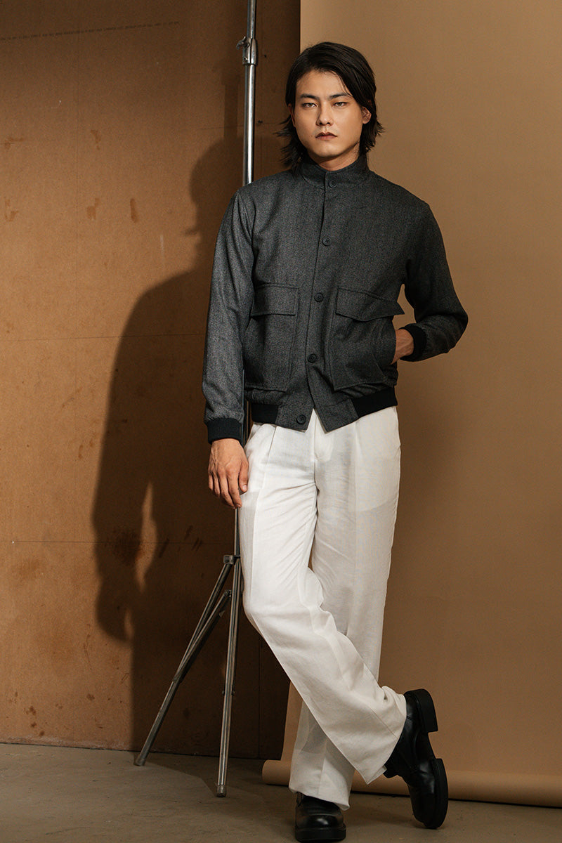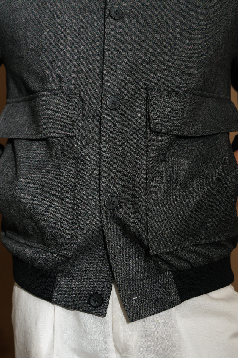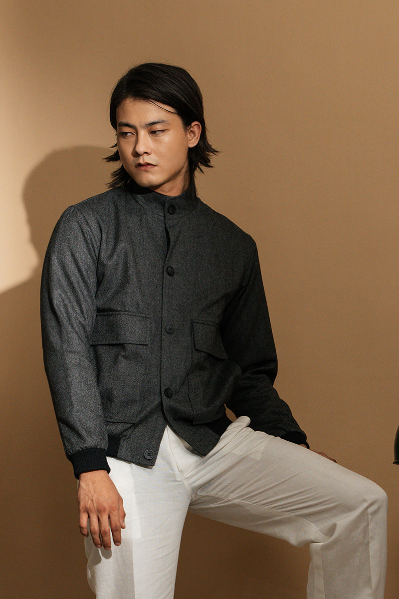 A charcoal grey jacket in a woolen fabric detailed with contrast ribbed cuffs and hem along with a mandarin collar and double patch pockets.