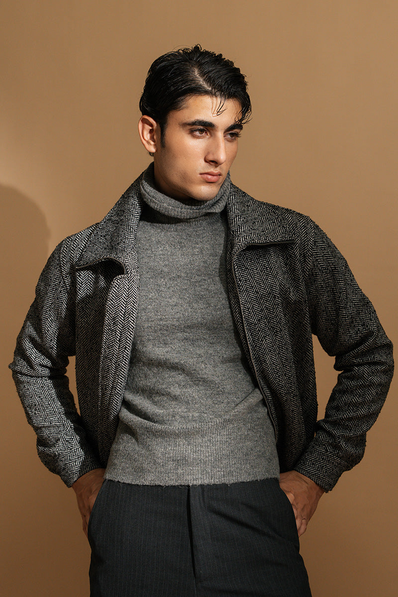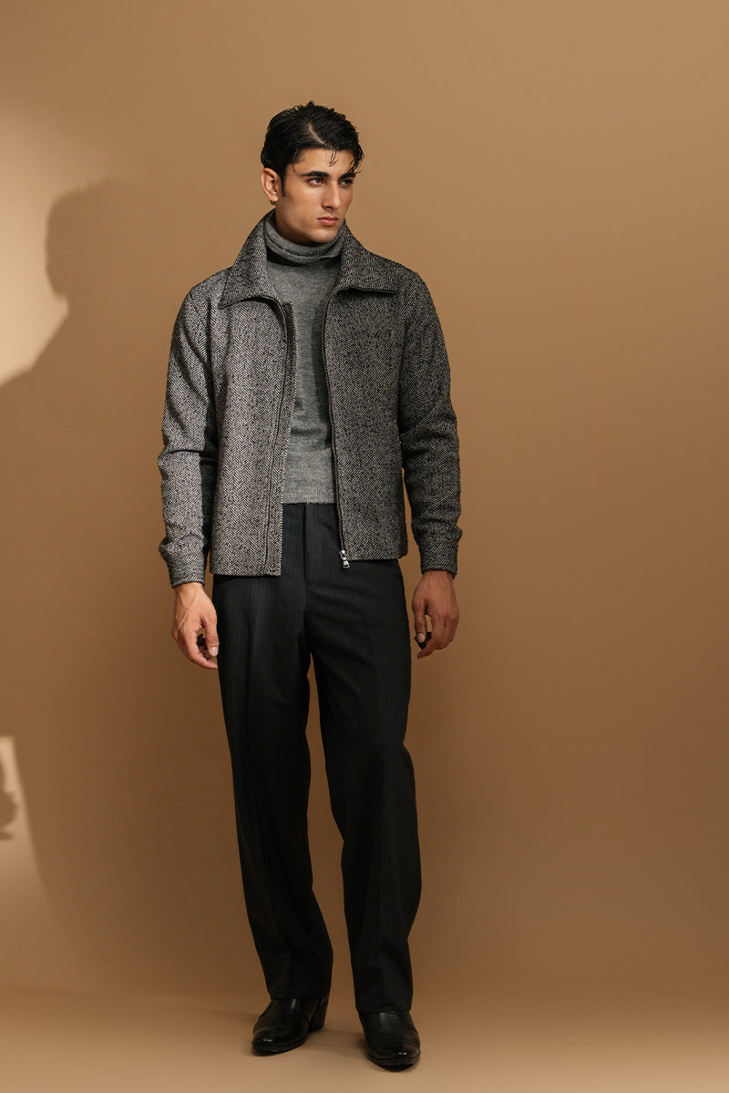 A light grey zip-up jacket in a woolen fabric detailed with a mock neck and welt pockets on the sides with cuffed sleeves and snap buttons.