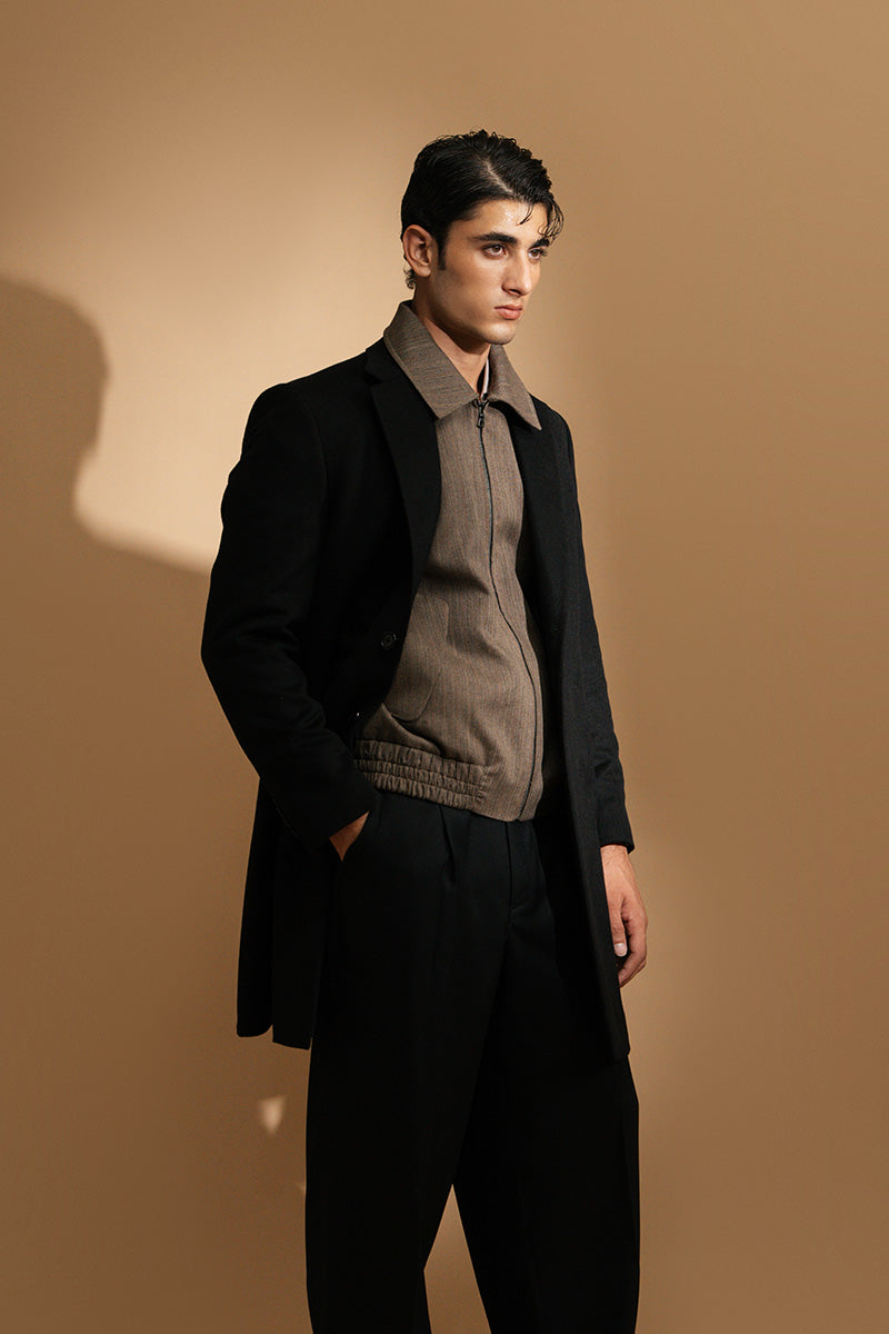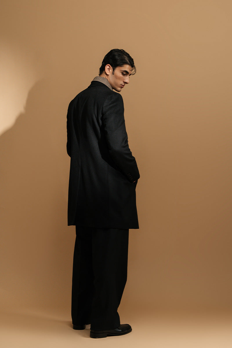 A classic black woolen coat detailed with a notch lapel, welt pockets and double buttons, along with a back vent at the center.