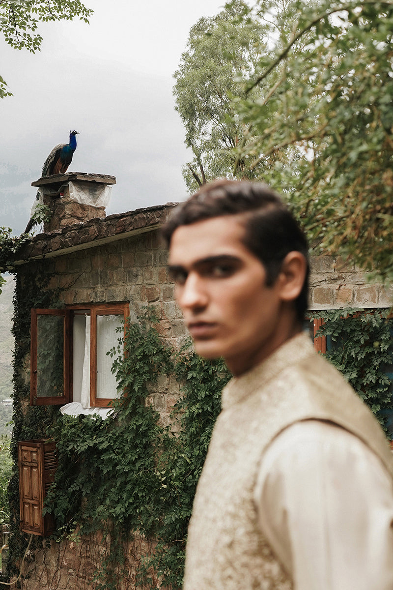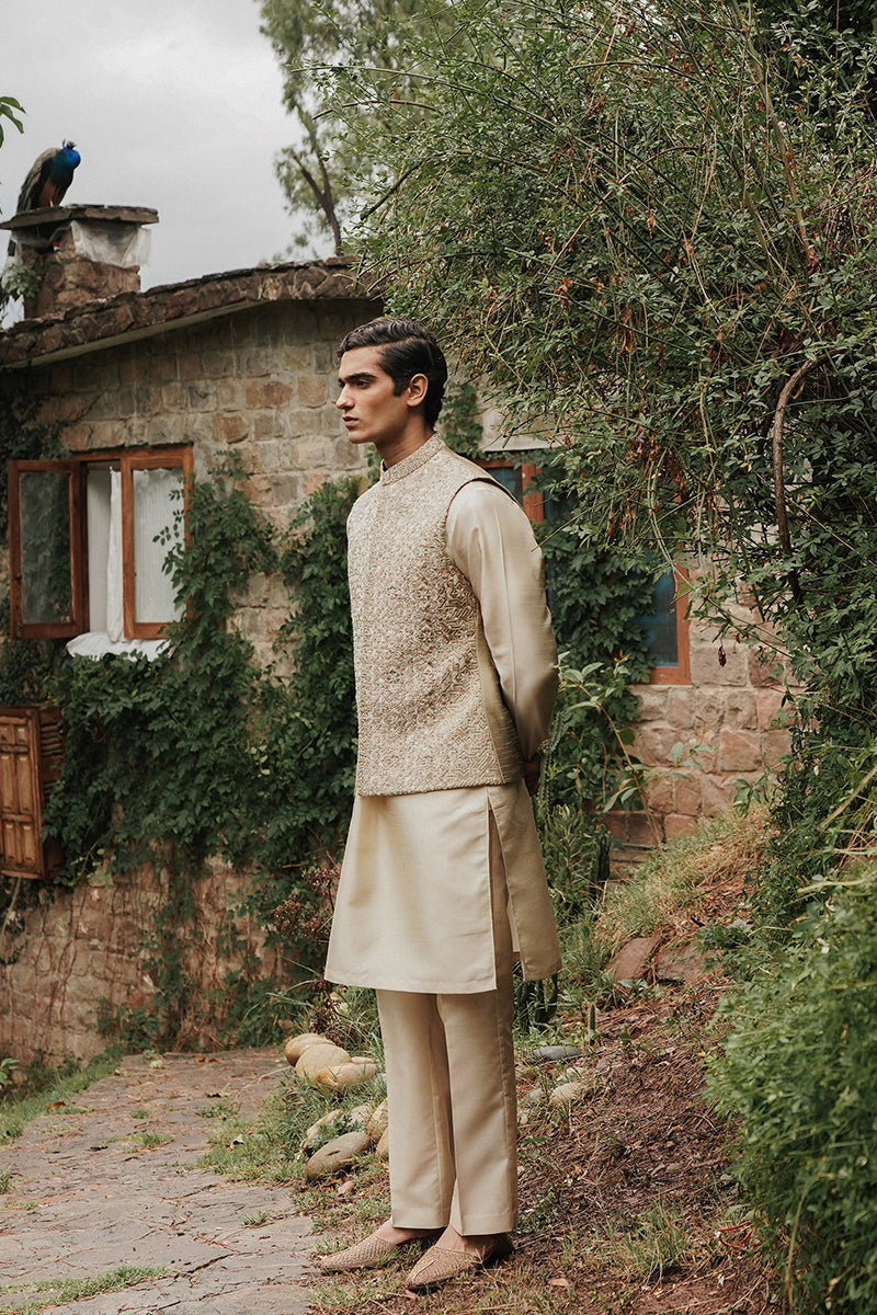 A meticulously crafted, hand-embroidered, raw-silk waistcoat, in a subtle shade of henna green. Paired with a soft-gold kurta and trouser set.