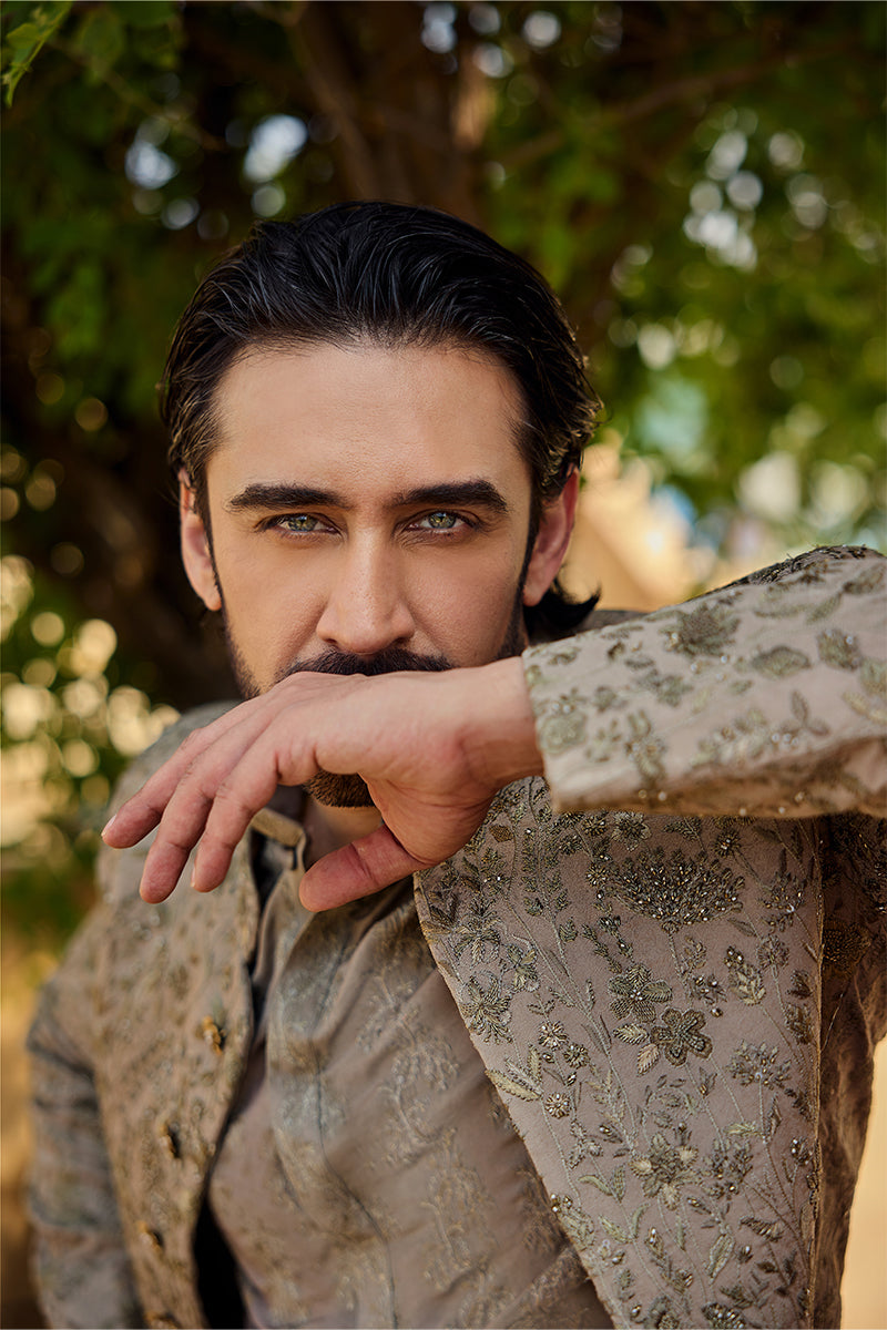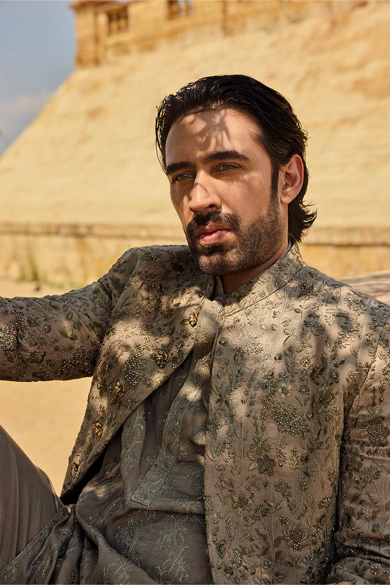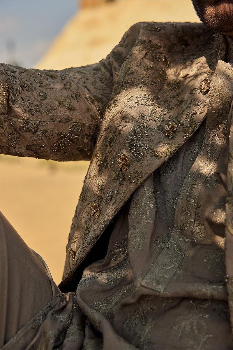 A subtle, muted olive green jacquard bandhgala jacket paired with embroidered kurta and pajama, featuring intricate resham and metallic thread embroidered pattern enhanced with traditional tilla work and delicate French knots. Detailed with nature-inspired floral embroidered patterns and metallic custom floral buttons.