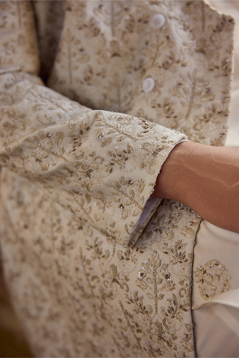 An ivory white embroidered jacquard sherwani adorned with an all over fusion pattern of contemporary designs, featuring white and gold hand renderings complemented by matte white embellishments. Intricately detailed with monotone kora and resham adda-work.