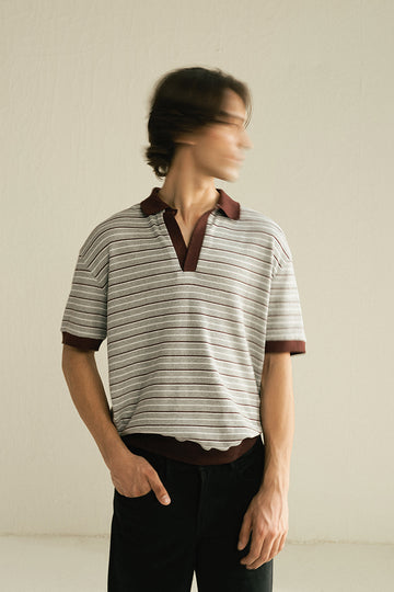 A grey and burgundy striped polo with burgundy ribbed sleeves, hem and collar. Fabric: Jersey Colour: Grey and Burgundy