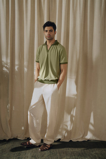 Sage green mesh polo with johnny collar and V-neckline. Detailed with contrast color ribbed  hem , collar and sleeves .