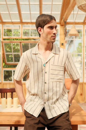 Dark brown, self textured striped shorts, with flap patch pockets  and  bone pocket.