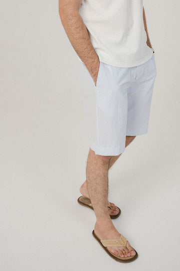 Sky blue cotton short with draw string fastening and partially elasticated belt at the back.   A collection of wearable, easy and classic pieces that will take you through the season. It's the perfect mix of fashion, comfort and everyday...