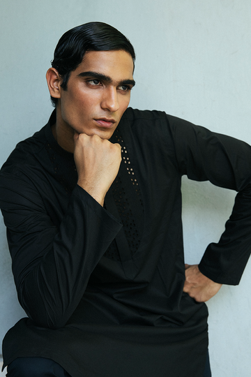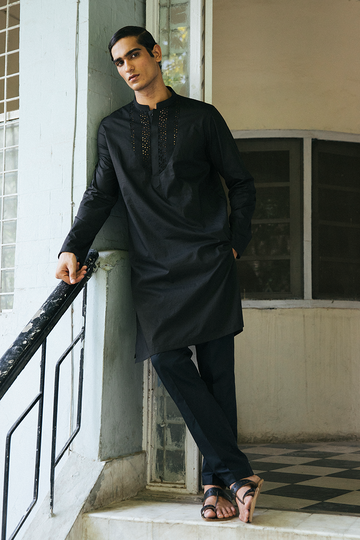 A black kurta pajama set detailed with geometric embroidered patterns.