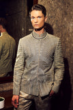 Ice grey, embroidered sherwani style kurta and pajama set, with embellished band collar and loop button closure.