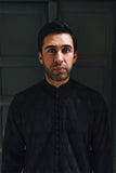 Onyx black chikankari, cotton kurta & pajama with pleated band collar, contemporary and mid-century floral motif patterns detailed with loop button closure placket and thread work.