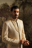 Pearl white embroidered jacquard sherwani, with floral and traditional mughal art embroidered patterns, Detailed with sequins and intricate threadwork. Paired with white kurta and pajama set with loop-button closures.