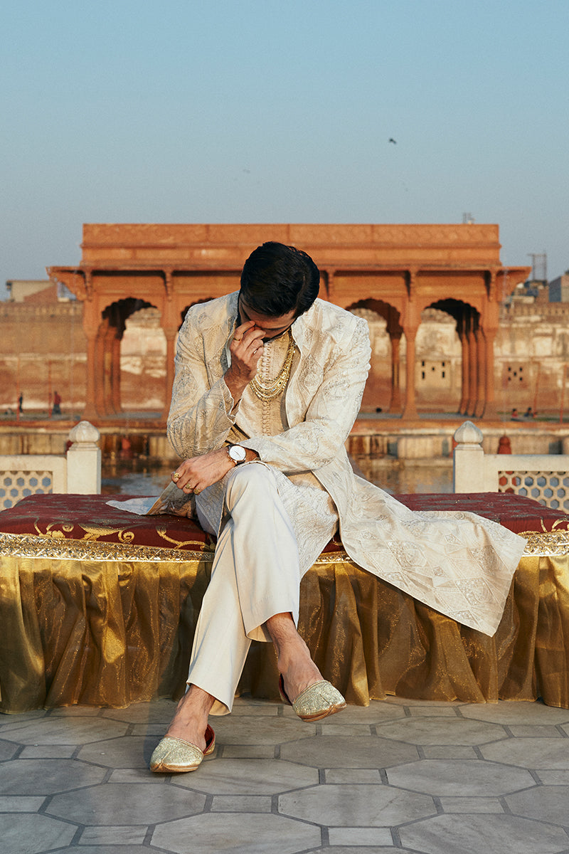 Silver gold organza front-open sherwani, with floral art-deco inspired geometric embroidered and floral linear patterns, detailed with sequins and tilla embellishments.