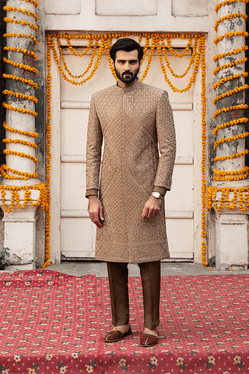 Dust gold traditional line work hand embroidered sherwani This price is inclusive of GST ALL INTERNATIONAL ORDERS WILL BE SHIPPED & DELIVERED WITHIN 15-25 DAYS