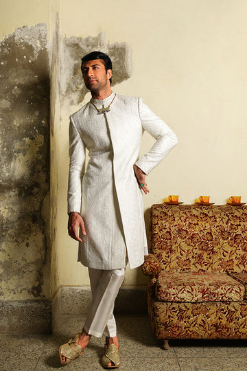 Ivory white multi-head sherwani with embellished band and fusion of geometric and mid-century floral motif pattern.