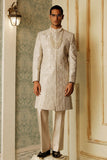 Onyx black, hand crafted jacquard sherwani, with floral hand embroidered double toned pattern. Detailed with silk french knots and sequins tilla.