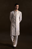 Made from a handloom jacquard fabric, this Dust Gold Sherwani highlights a detailed all-over geometrical pattern, skillfully created with the Marori technique.