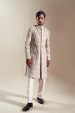 Beige handmade jacquard sherwani inspired by the traditional craftsmanship of Kashmir and the Kilim weave technique. Adorned with paisley floral hand embroidered patterns , delicate French knots, sequins, resham, and tilla embellishments; making it a true work of art.