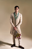 Elevate your style with our exquisite Taupe handloom sherwani with hand embroidered Streamline Modern patterns, meticulously crafted with intricate Kashmiri techniques and adorned with stunning ganga jamni , french knots, tilla and resham embellishments. A true masterpiece of art and fashion.