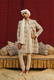Black jacquard fabric front-open sherwani, with floral embroidered patterns, adorned with shades of mid-night blue embroideries, detailed with resham and sequins embellishments.