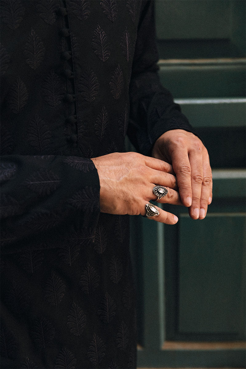 Carbon black multi-head mid-century floral motifs kurta and pajama set, with pleated band collar and loop button closure.