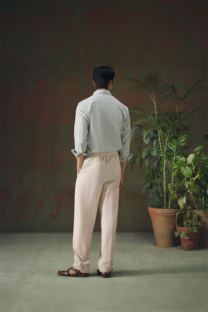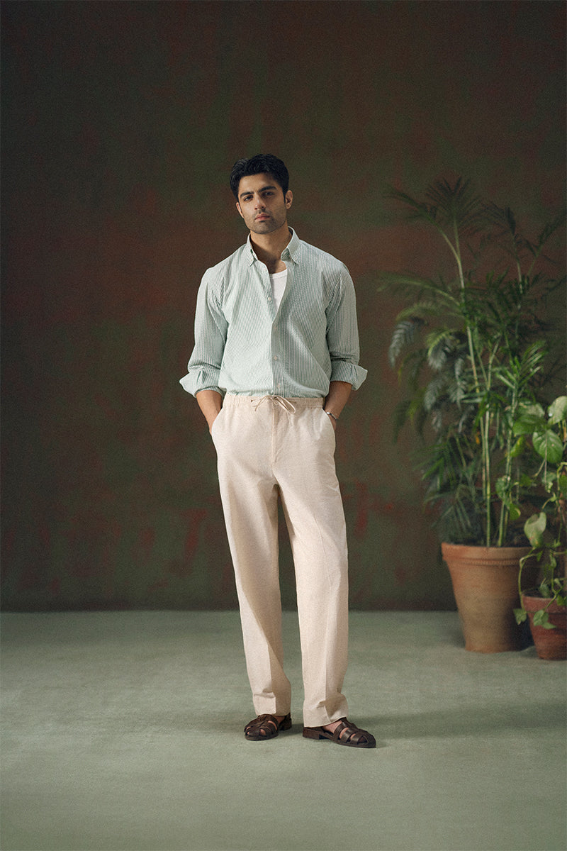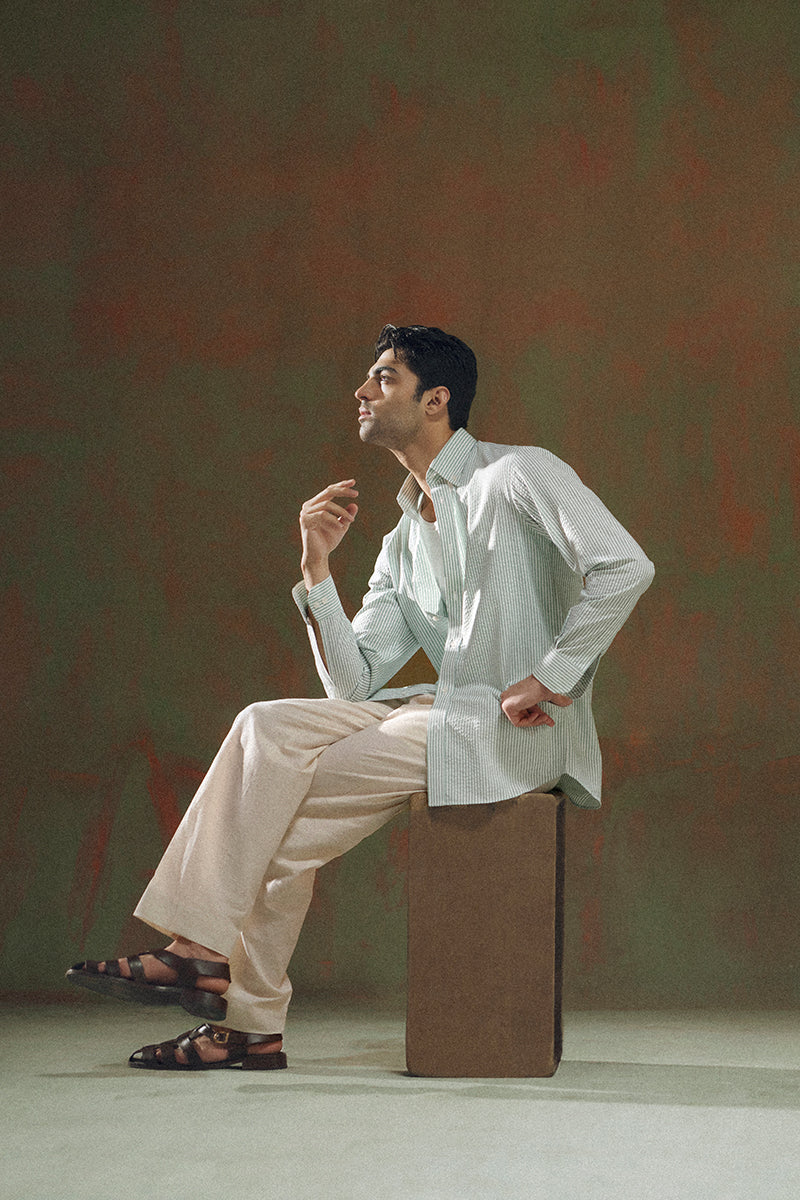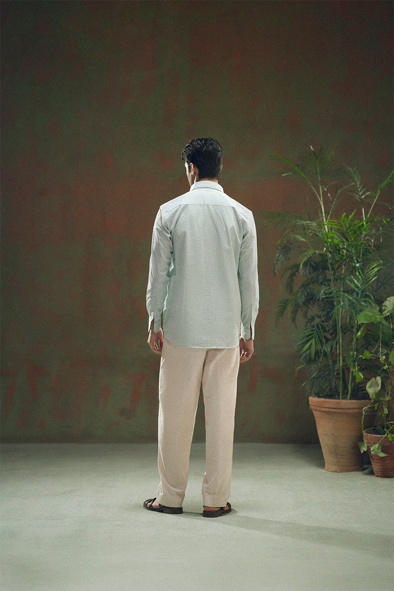 Sage green cotton bold striped button down shirt with French collar, detailed with french button placket.