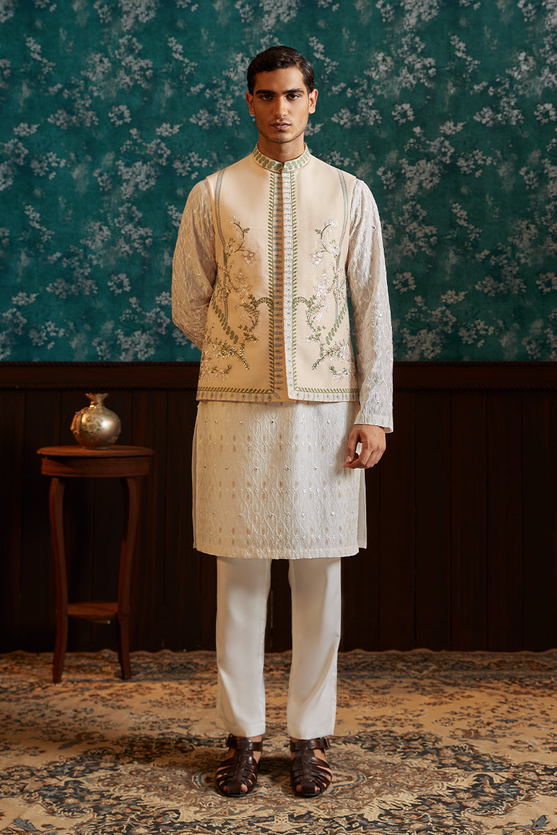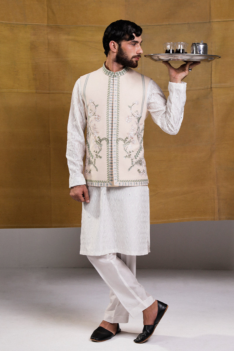Sand brown waistcoat, with mid-century floral pattern, detailed with sequins and tilla.
