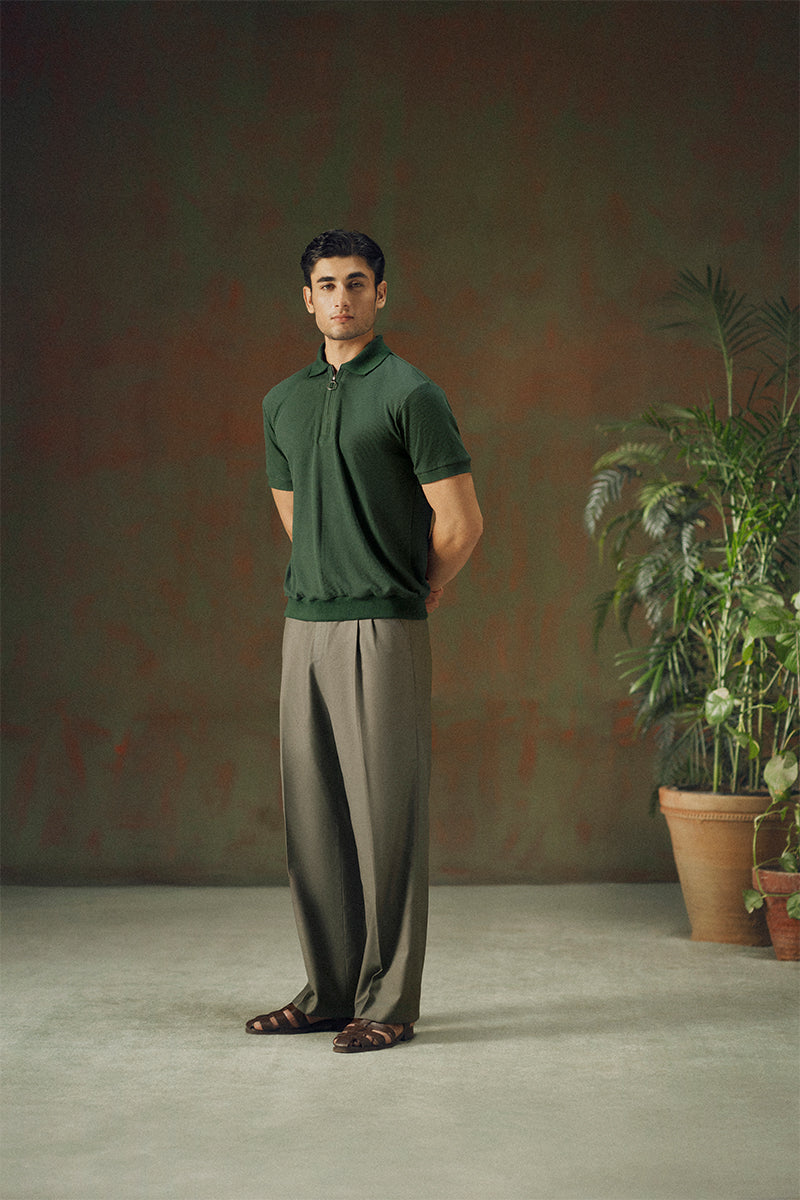 Deep green thermal fabric zipped-up polo, with contrast collar and hem detailing. Detailed with ribbed hem and sleeves.