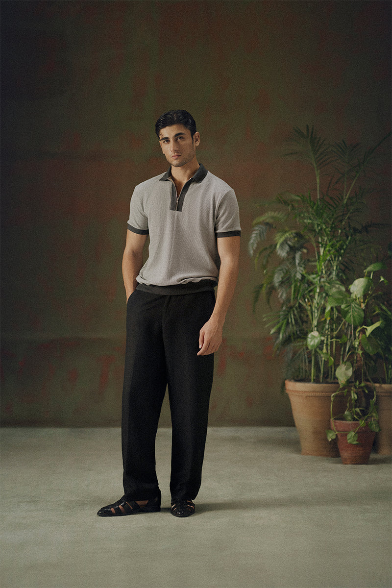Ash gray thermal fabric zipped-up polo, with contrast collar and hem detailing. Detailed with ribbed hem and sleeves.
